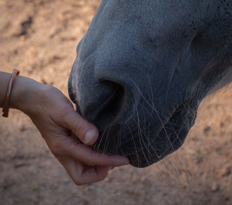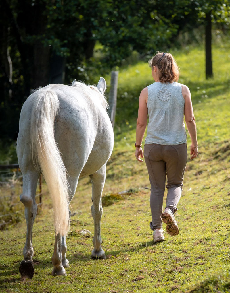 Le balancement naturel du cheval et son calme sécurise et engage naturellement la personne à se relâcher pour le suivre et s’y relier.